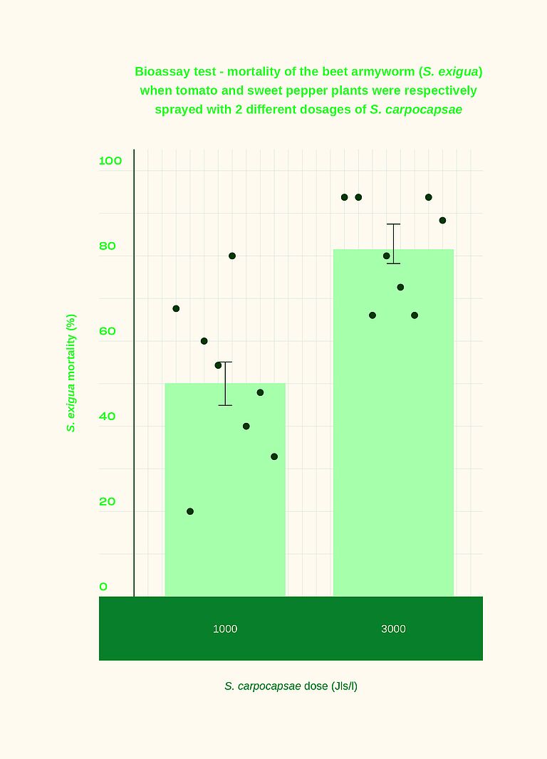 De R&D-afdelingen op verschillende Koppert-locaties doen al jaren onderzoek naar bladtoepassingen van onze nematoden. Uit ervaringen in het laboratorium en het veld blijkt dat Entonem en Capsanem een significante werking hebben tegen allerlei rupsen. Hierbij blijkt ook dat een droog bladoppervlak de nematoden niet tegenhoudt, hoewel ze zich het efficiëntst verplaatsen in een vloeibare laag. Afhankelijk van de klimaatomstandigheden overleven nematoden urenlang tot enkele dagen op het bladoppervlak.