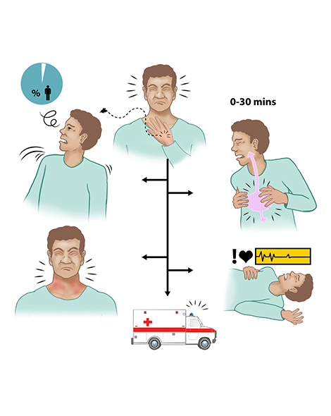Graad 4 - graad 1 en/of 2 en/of 3 verschijnselen, plus hartkloppingen, wegraking, anafylactische shock (met duizeligheid, overvloedig zweten en koude rillingen).