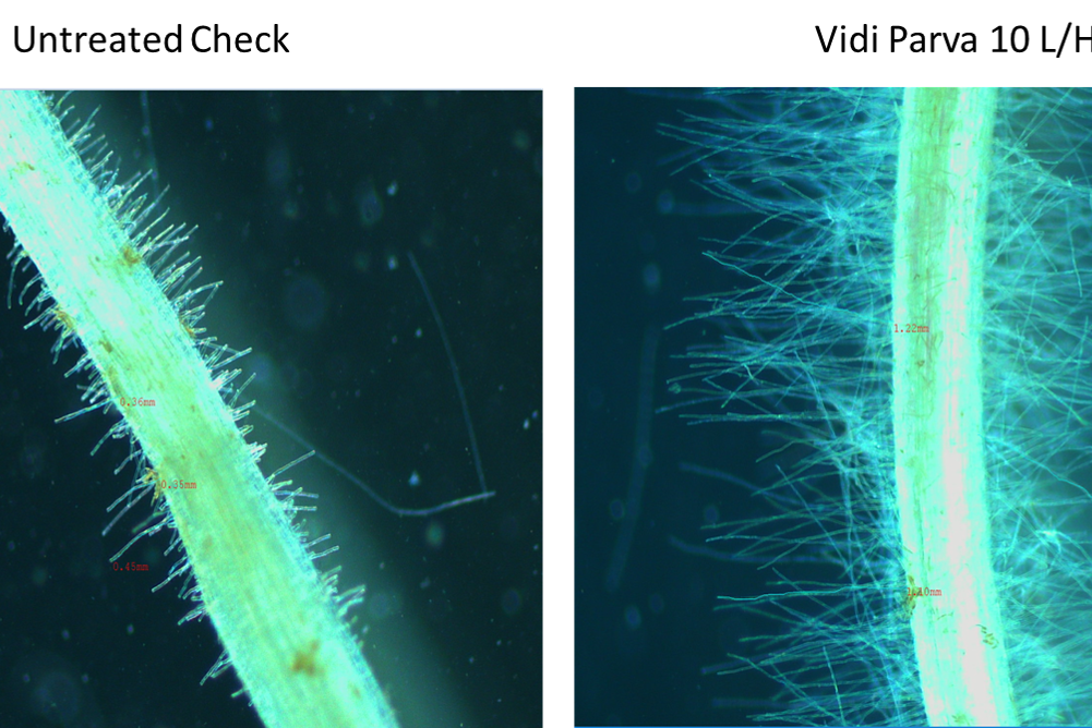 Onze biostimulant Vidi Parva bevat o.a. tryptofaan, een aminozuur dat onmisbaar is voor een plant voor de natuurlijke aanmaak van auxine. Deze auxine stimuleert de vorming van fijne haarwortels en deze haarwortels bevorderen de opname van voedingselementen. Om deze haarwortels goed te beschermen tegen een aantasting door schadelijke schimmels kan ons biofungicide Trianum ingezet worden. Vidi Parva is samen met Trianum een ideale basis voor een sterk en gezond gewas. Herhaal de toepassing van Vidi Parva in de eerste 3 weken met een dosering van 5 liter per ha. Een goed groeiende plant is de beste basis voor een goede gewasbescherming.