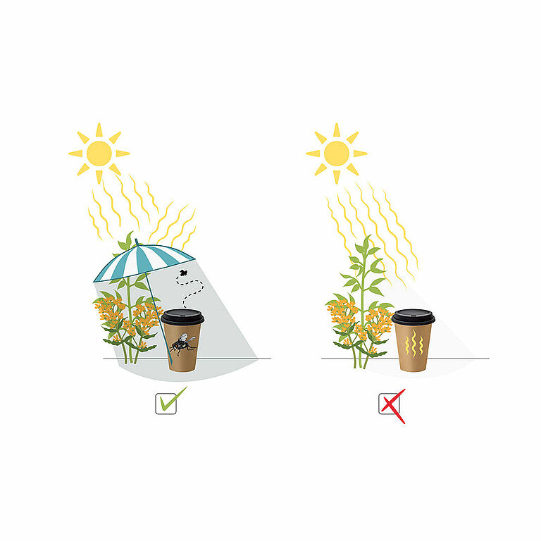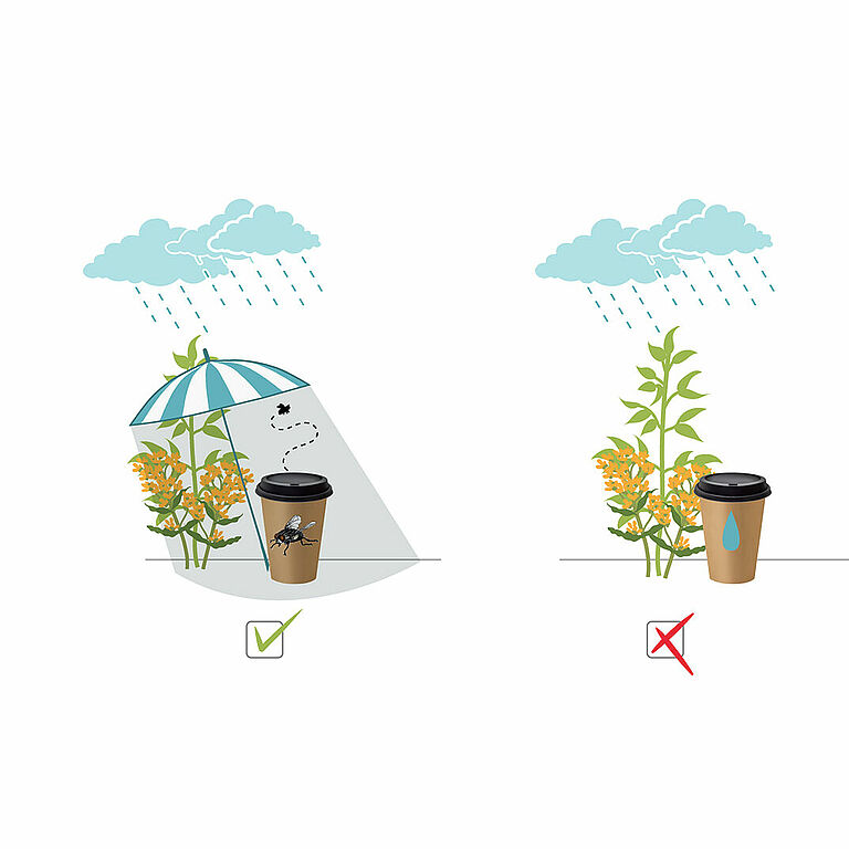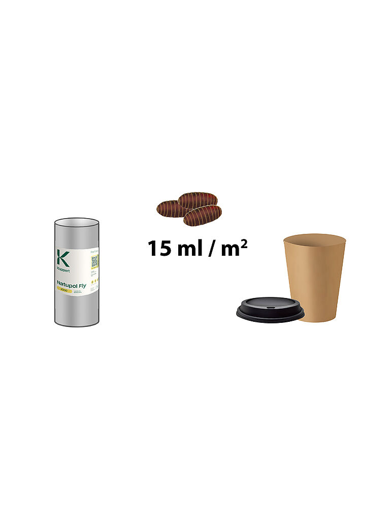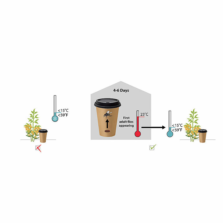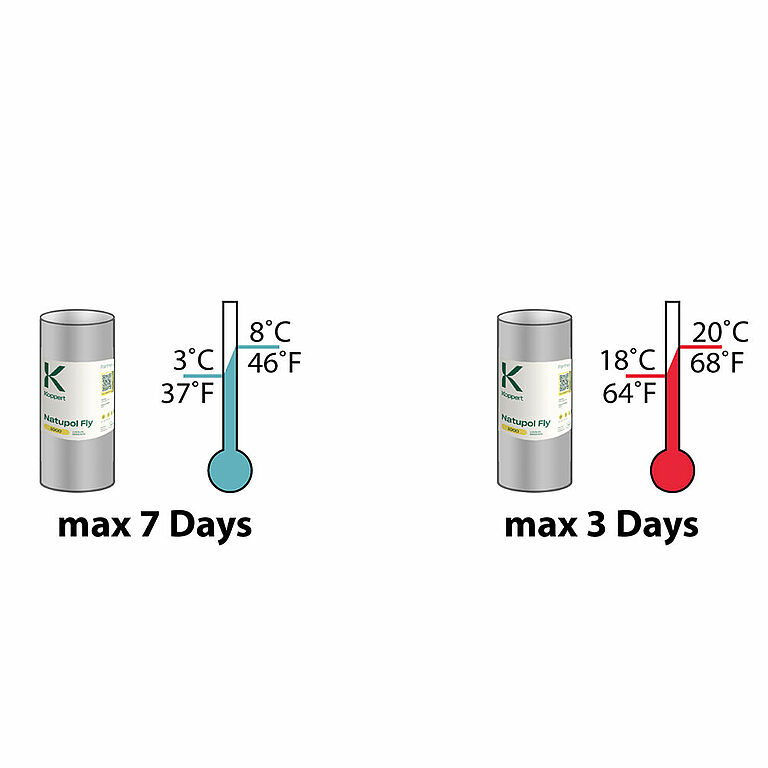 Zet Natupol Fly niet zonder voorbereiding uit in een toepassing met een temperatuur onder 15˚C. De uitkomst is dan onvoorspelbaar en duurt vaak langer dan 1 week. Laat Natupol Fly, in geval van toepassing bij een temperatuur onder 15˚C, eerst afrijpen in een warme omgeving. Plaats Natupol Fly in de toepassing nadat de eerste volgroeide vliegen verschijnen.