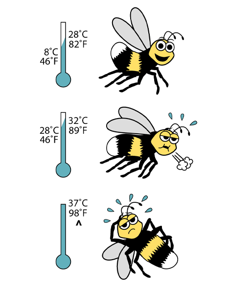 Hommels zijn actief bij een temperatuur tussen 8 en 32 graden Celsius. Zij werken optimaal bij temperaturen tussen 8 en 28 graden Celsius. Bij temperaturen van 28 tot 32 graden Celsius vermindert langzaam hun activiteit. Bij nog hogere temperaturen stoppen de hommels met vliegen. Vanaf dat moment koelen de hommels de kolonie totdat de temperatuur weer daalt onder 32 graden Celsius.