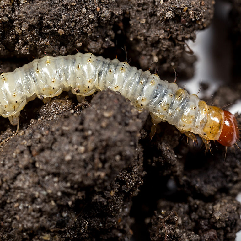 De ernstigste schade ontstaat in het najaar, de winter en het voorjaar. Aardbei wordt vaak aangetast, vooral als het gewas wordt geplant op onlangs geploegd grasland. De larven boren grote tunnels in de kroon, waardoor de groei vertraagt en de plant verwelkt. Ernstig aangetaste planten kunnen doodgaan. Soortgelijke symptomen worden waargenomen in andere aangetaste gewassen.