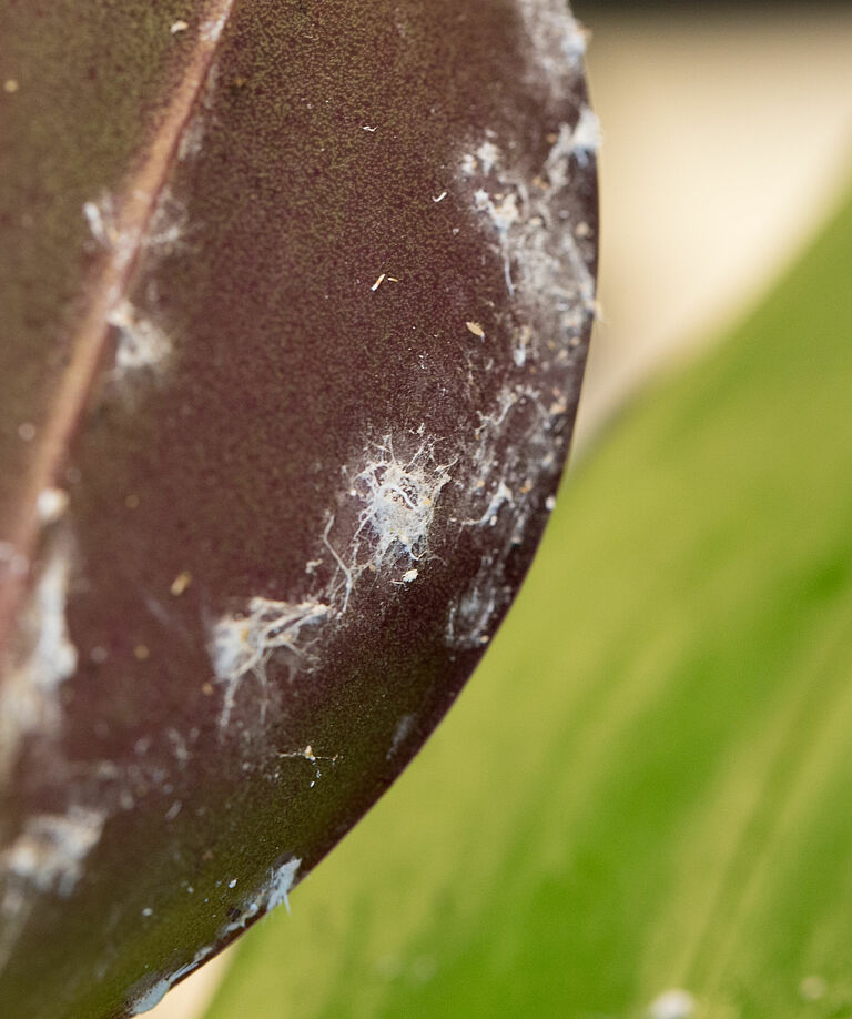 - De nimfen en vrouwtjes zuigen plantensap op. Hierdoor wordt de groei belemmerd en ontstaat er misvorming en/of vergeling van het blad, soms gevolgd door bladverlies. Het resultaat is verminderde fotosynthese en dus lagere opbrengst. Bloemen en vruchten vallen vaak af.