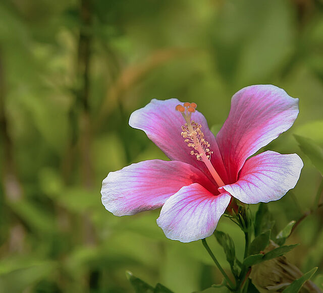 - Hibiscus staat bekend om zijn grote, sierlijke, trompetvormige bloemen. Deze bloemen hebben vijf of meer bloembladen en hun kleur varieert van wit tot roze, rood, oranje, perzik, geel en paars.