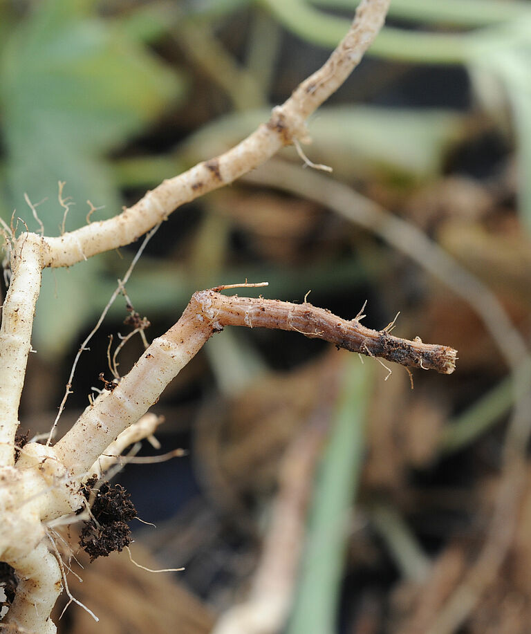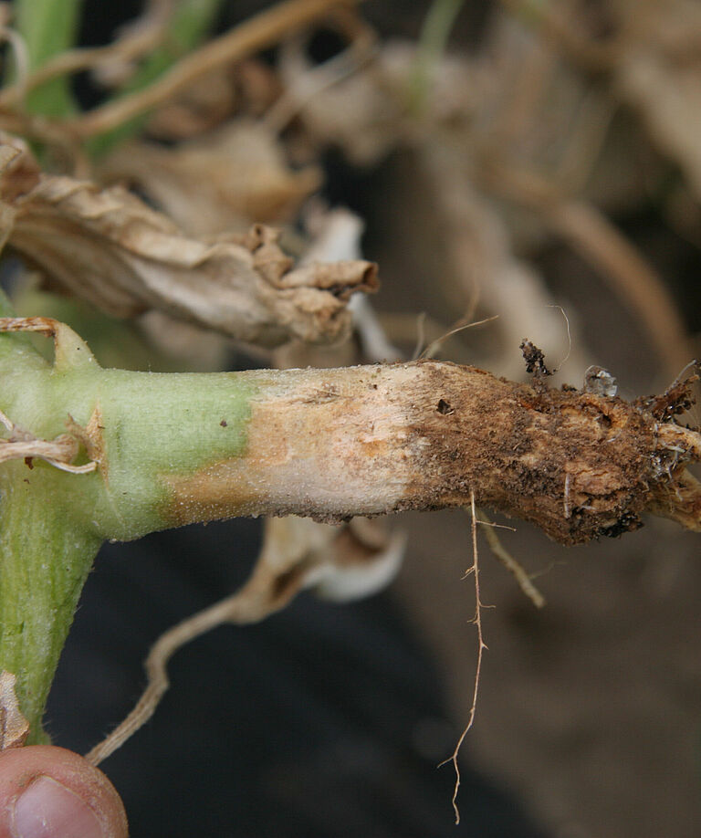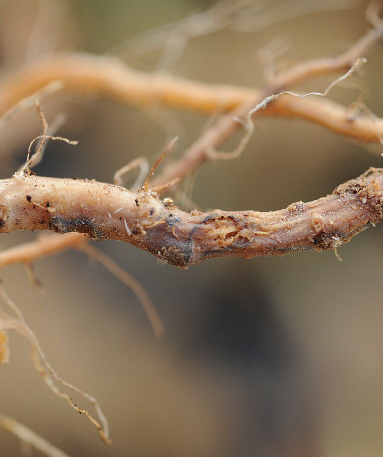 De ziekte blijft meestal beperkt tot enkele wortels, maar bij een ernstige aantasting kunnen alle wortels geïnfecteerd raken. In het laatste stadium van de ziekte blijft alleen het vaatweefsel over, doordat de schors (de buitenste wortellaag) weggerot is. Infectie van jonge planten leidt tot groeiachterstand en kleinere, intens groene bladeren. Bij een zware aantasting kunnen planten in dit stadium afsterven. Bij minder ernstige infecties kunnen de uitlopers in een laat ontwikkelingsstadium afsterven. Als er eerder in het seizoen echter gebrek aan water is geweest, bijvoorbeeld tijdens periodes met veel verdamping, kan het gewas eerder verwelken. Bij verwelkte planten ziet de kroon er aanvankelijk uit alsof hij nat is. Hij wordt lichtbruin en verzonken, later zwart met geelbruine sporen. In het beginstadium van de verwelking is de ziekte lastig te onderscheiden van andere verwelkingsziekten.